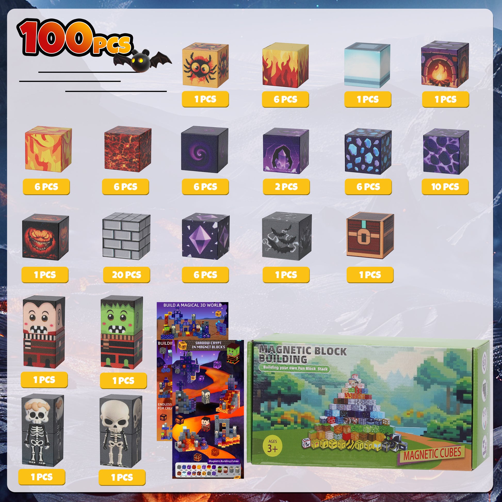 Crtynell 100PCS Magnetic Blocks - Build Lava Cave World Set for Boys & Girls Age 3-5 6-8, Sensory Toys for Toddlers Birthday Christma Gifts for 3+ Years Old Girls Boys