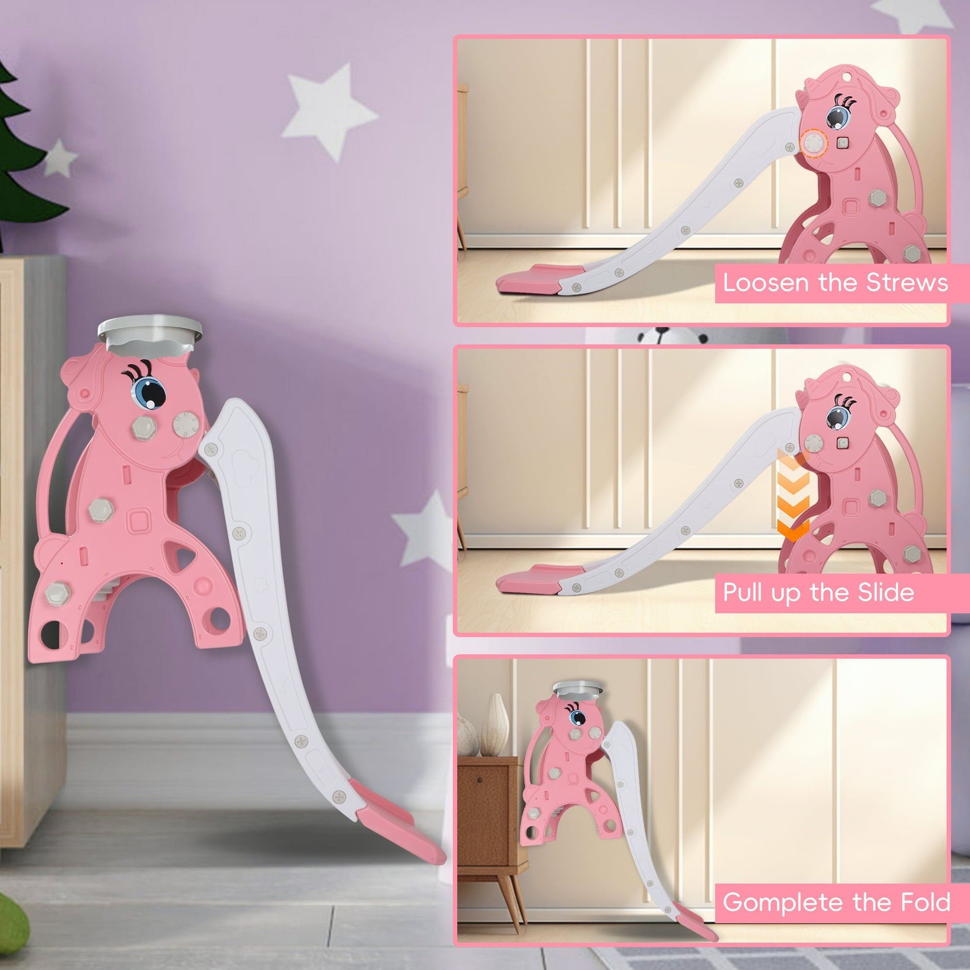 - 【Cute Design】This slide set is colorful and cute with ponies, which will make your child fall in love with it at first sight. In addition, the lightweight design allows you to move it to the children's playroom, living room or backyard effortlessly.