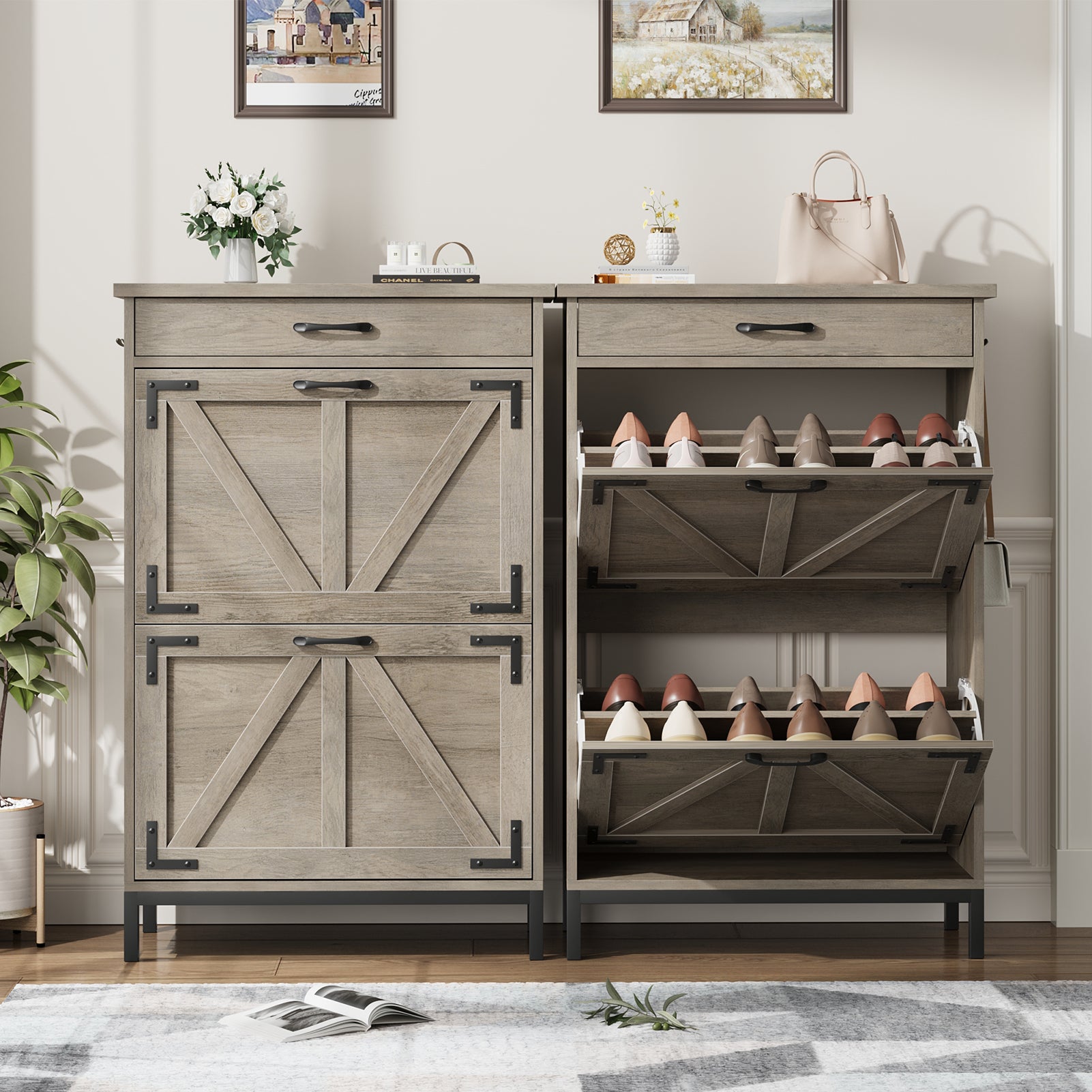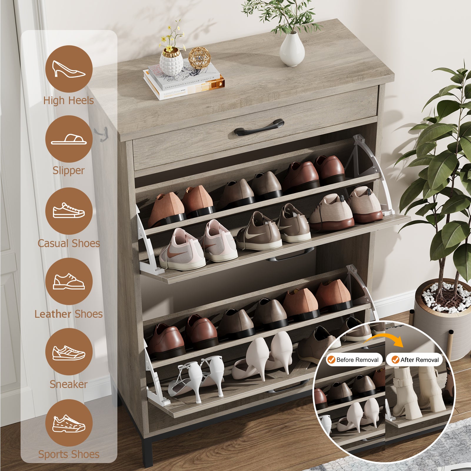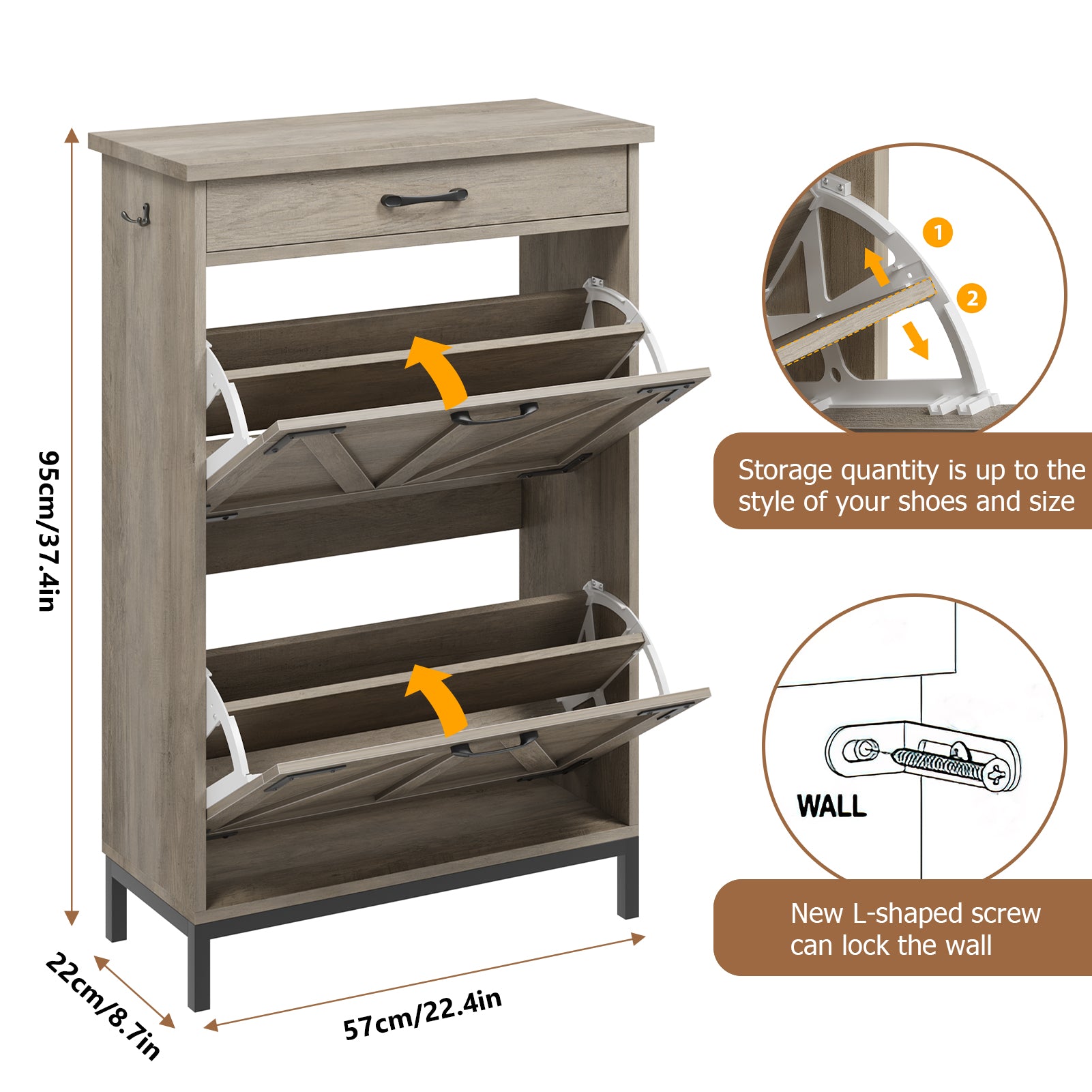 Loewten Shoe Cabinet Storage with 2 Flip Drawers & 1 Drawer,Narrow Free Standing Shoe Organizer Cabinet Slim Shoe Cabinet for Hallway,Gray